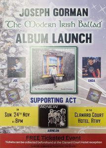 An event not to be missed. Joseph Gorman is launching his album ‘The Modern Irish Ballad’ on Sunday 24th November at 8pm in the Clanard Court Hotel, Athy, with an amazing supporting act Aireán. It is a FREE ticketed event. Tickets can be collected at the Clanard Court Hotel Reception.